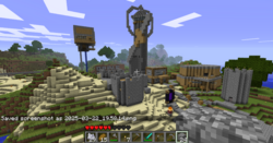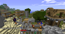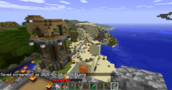 Notable features: Pillager Outpost, large star structure, tavern, several houses, underground city, nether portal, desert temple–themed mall (in progress), parkour course, fiery meatballs used for lighting the town (placed by GREENAPPLE)